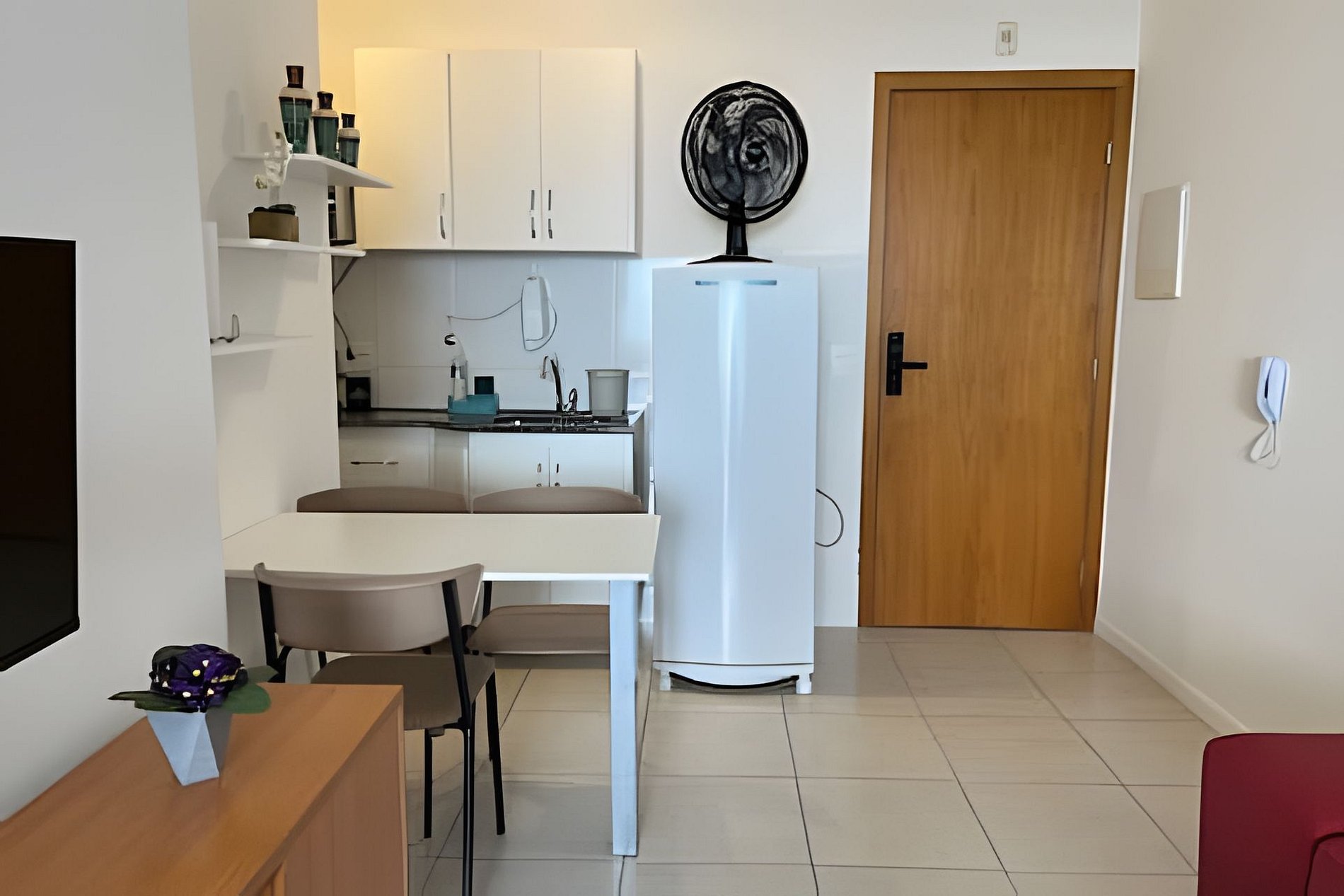 O apartamento possui um ventilador de mesa e ar-condicionado.