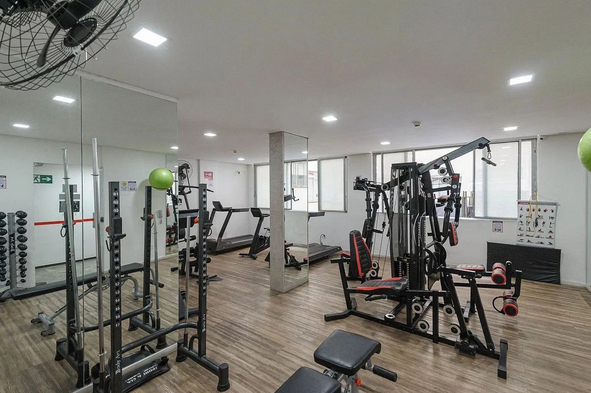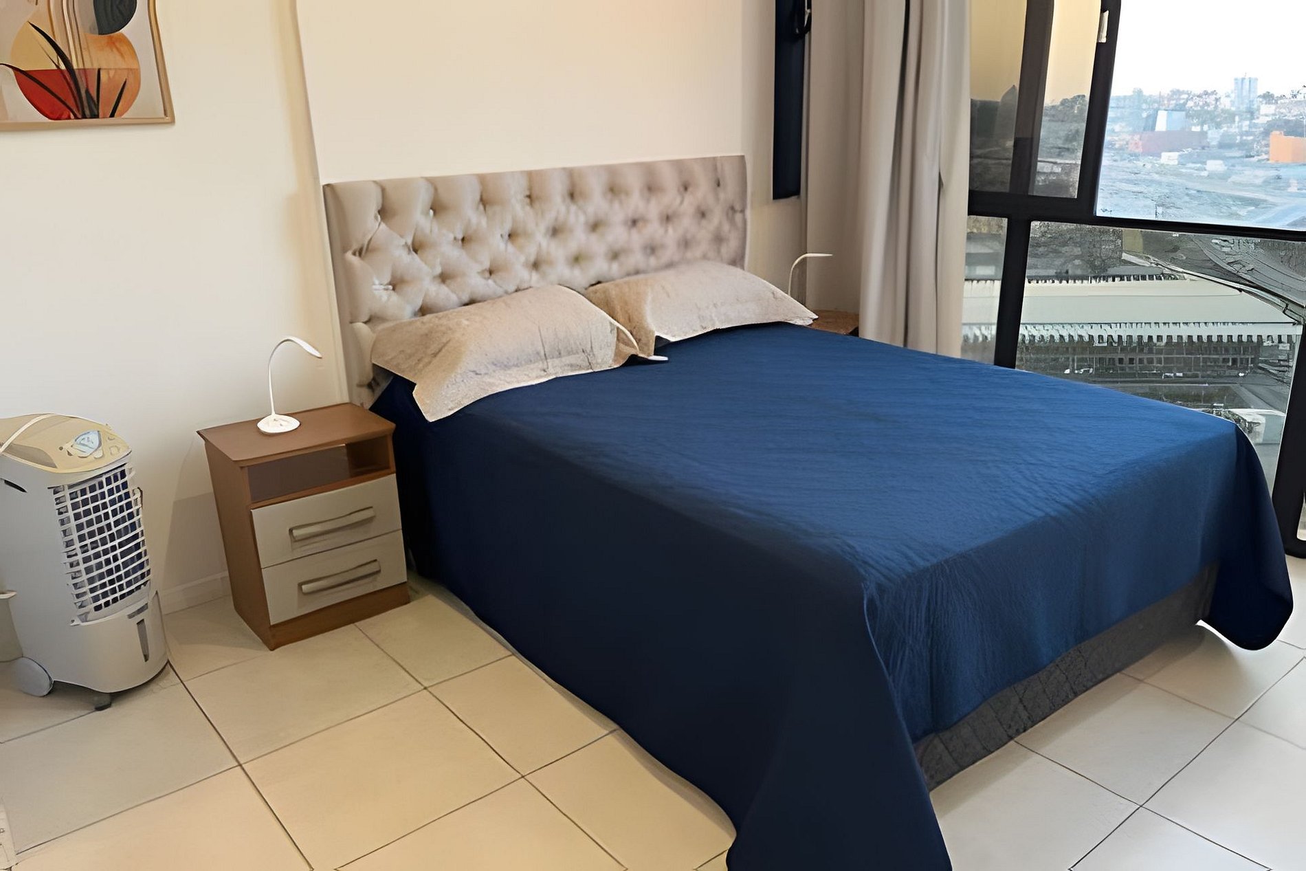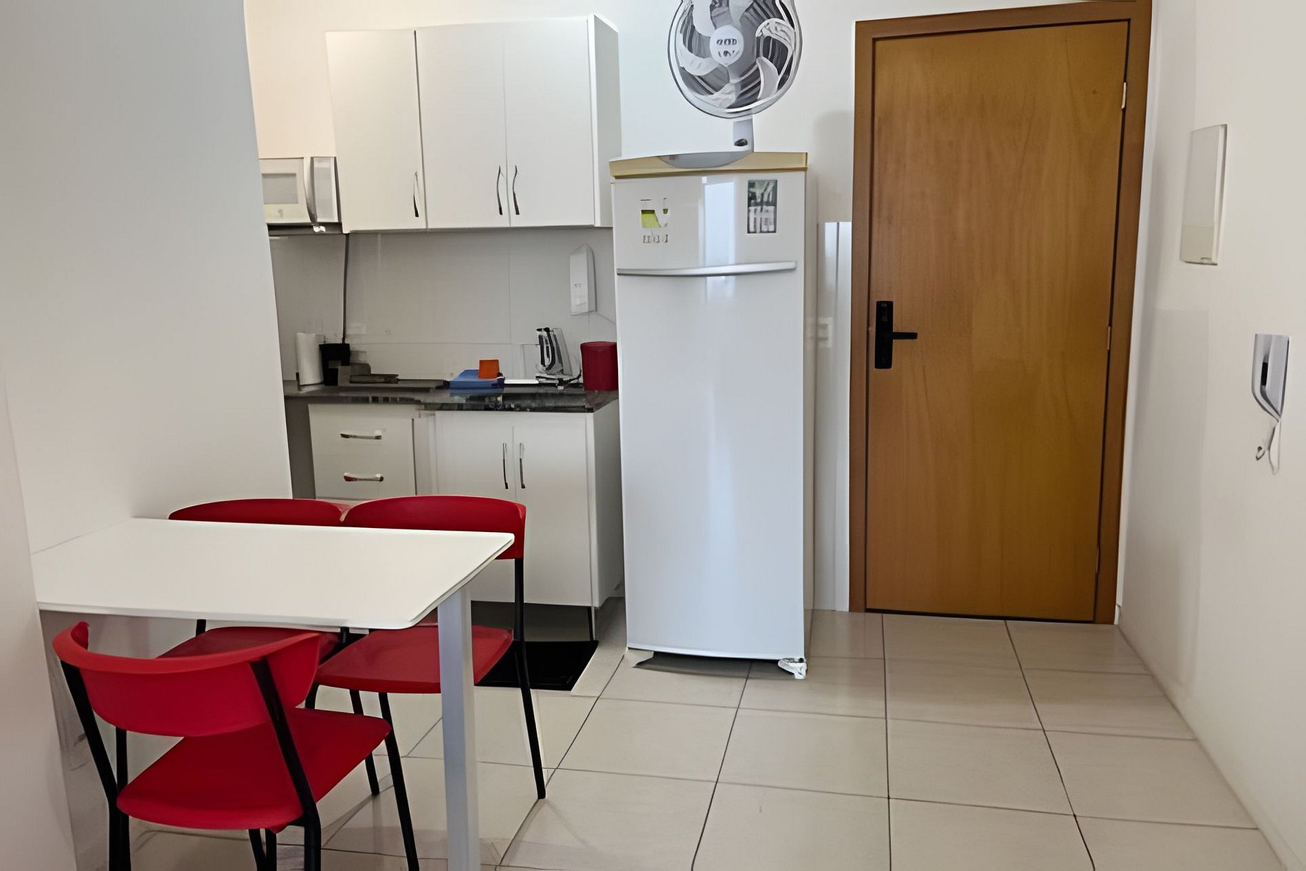 O apartamento possui um ventilador de mesa e ar-condicionado.