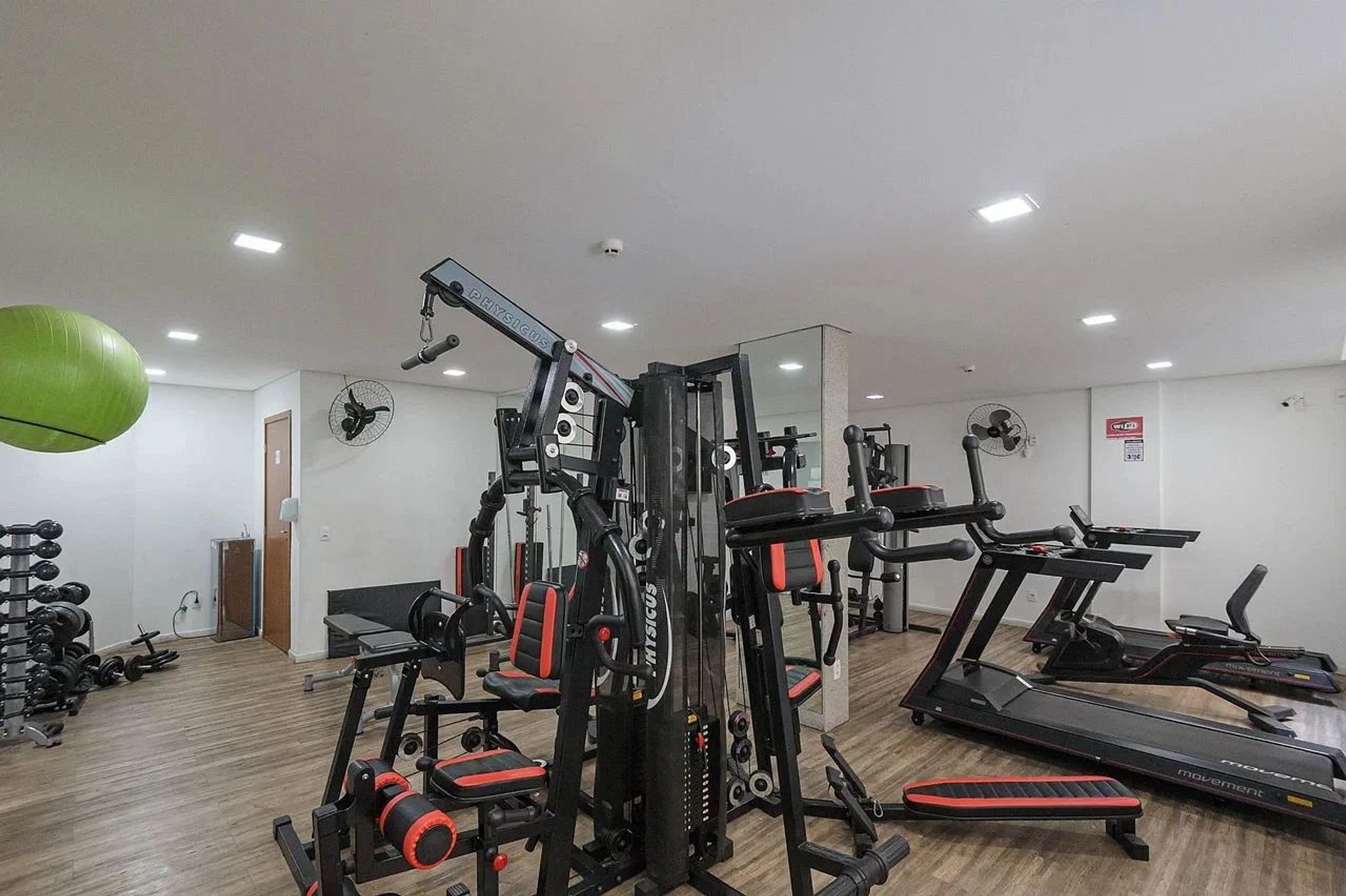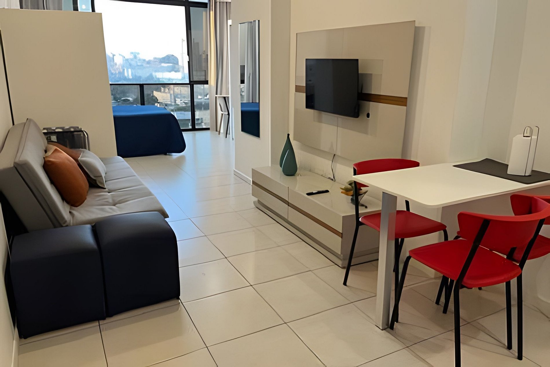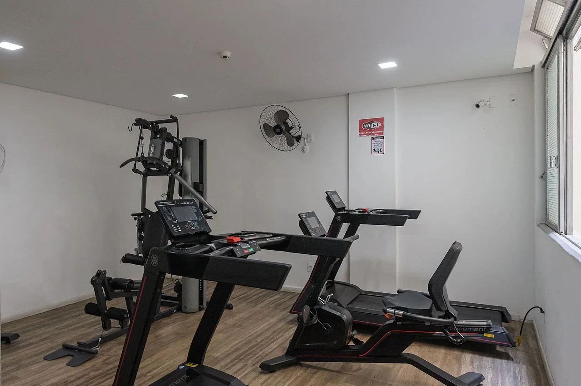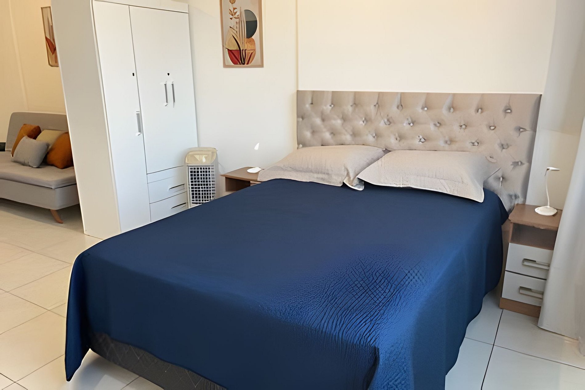 O apartamento possui um ventilador de mesa e ar-condicionado.